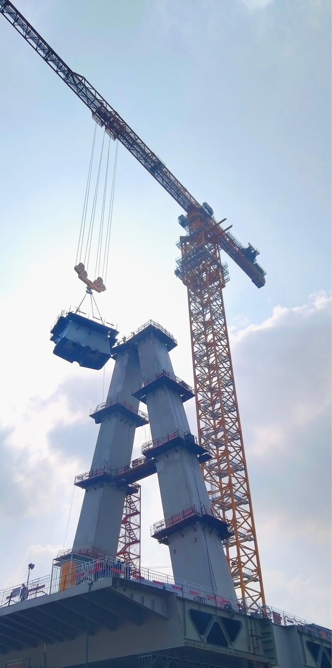 为提升建设速度、尽量减少施工影响,项目方采取装配式施工,先制作好大量预制构件,再拉到现场的设计位置进行拼装,以“搭积木”的方式建桥。由于建设过程涉及水上作业、大件吊装等重大方案,还具有制作安装精度要求高、重型吊装作业量大、协调工作接口多等特点,为保证预制结构顺利起吊安装,项目方、租赁公司携手中联重科,量身定做了超大型塔机R4300-200。