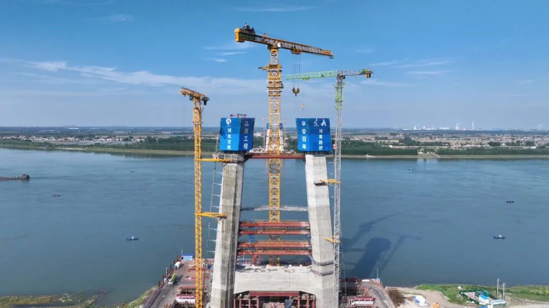 横江跨海,万桥如虹,绘就神州壮丽画卷。近日,在中联重科塔机持续助力下,世界**大跨度公路斜拉桥——观音寺长江大桥传来喜讯,其南岸、北岸的主塔“茁壮成长”,突破百米大关挺立至102米的高度,这标志着大桥主塔建设正式迈入百米超高空的新篇章。
