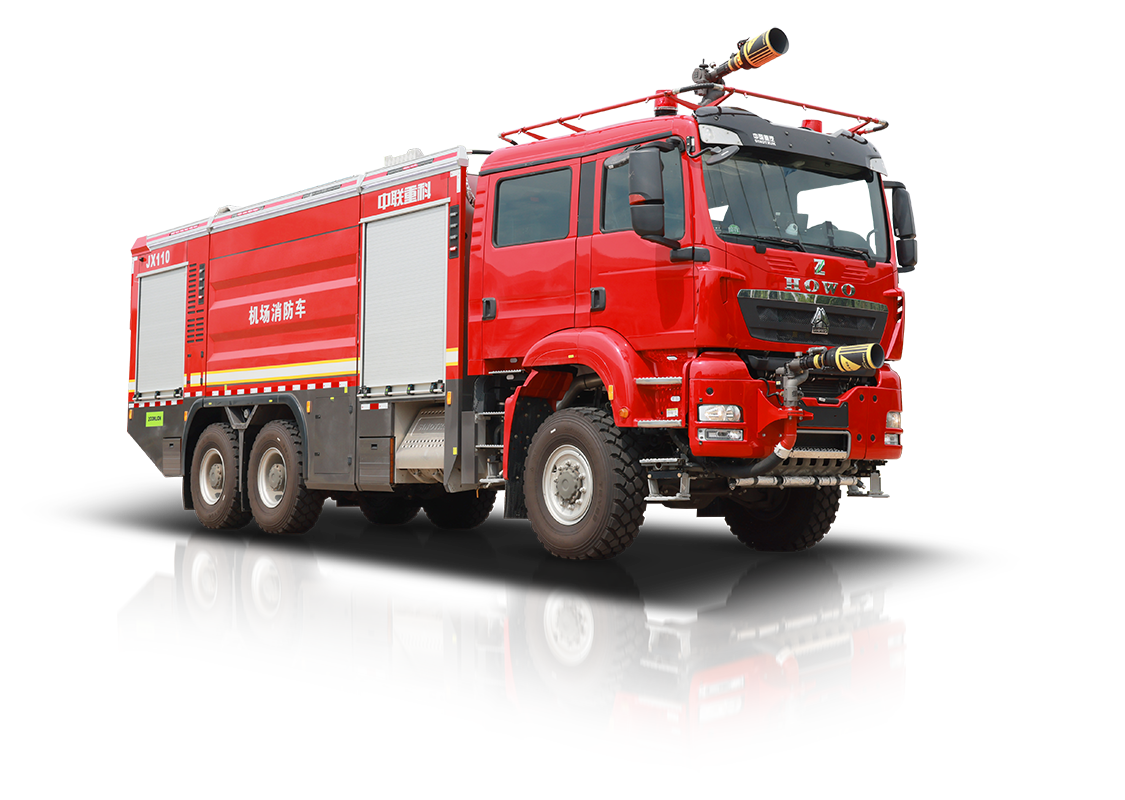 中联牌JX110A6型机场主力泡沫消防车,采用国内知名品牌6×6特种商用越野底盘改装,底盘动力强劲,搭载自动变速箱,加速快,车速高,救援更高效;消防水泵由独立专用大功率发动机驱动,行进中可随时开启消防系统灭火;配有大容量灭火剂罐,搭载智能灭火喷射系统,操作简单,在驾驶室内即可完成所有灭火救援操作,能快速扑救飞行器火灾,是各类机场必备的火灾救援主力装备。